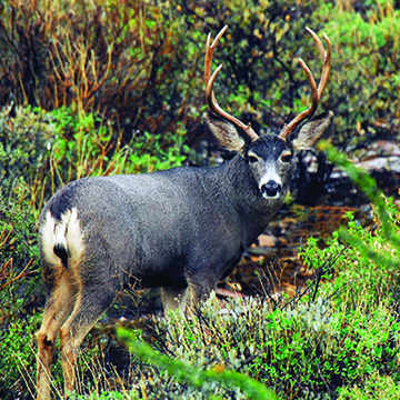The mule deer gets its name from its large ears. Coat color is reddish-brown in summer, turning to a blue-gray in winter.